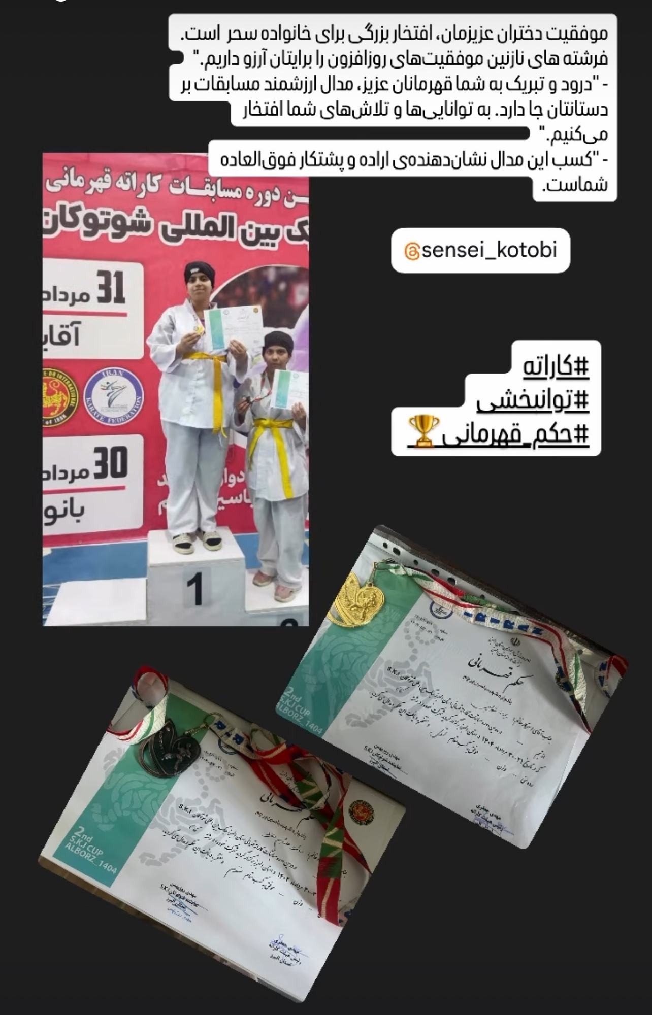 تبریک‌به خانواده مرکز سحر جهت کسب حکم قهرمانی مسابقات کاراته بخش کاتا